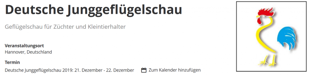 Sonderschauen 128. Lipsia-Schau und 97. Deutsche Zwerghuhnschau (Leipzig) 05.-07.12.2025 Hompage + Meldepapiere Lipsia 107. Nationale Bundessiegerschau (Erfurt) 17.-19.10.2025 Homepage + Meldepapiere Erfurt