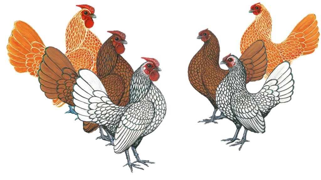Rassemerkmale: Hahn (hennenfiedrig) und Henne gleich.
